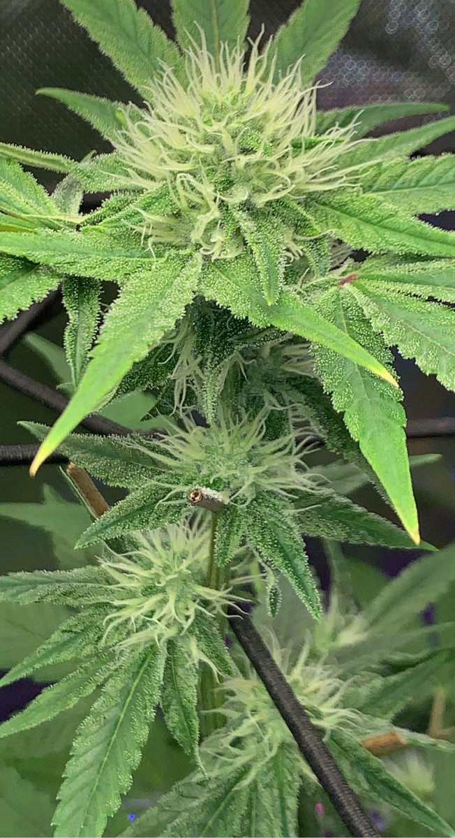 Ращу два сорта в одной палатке и все они выглядят морозными! Все сорта чрезвычайно крутые! GG4 пахнет сладко, сканково и фруктово. Куст GG4 был полностью зеленым, за исключением некоторых стеблей веерных листьев от пурпурного до коричневого.
