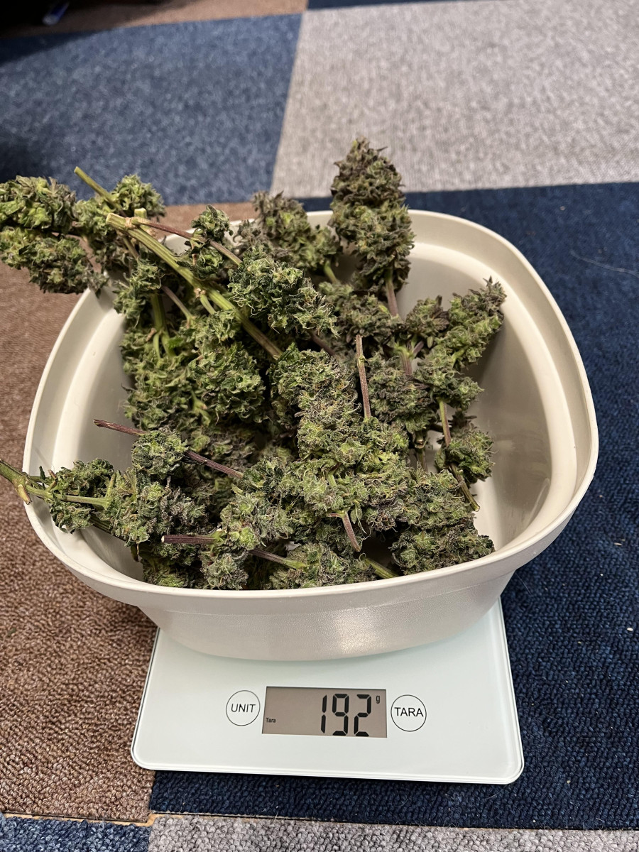 До момента сбора урожая растишка провела неделю без полива. Срезанный под корень куст сразу весил 320 грамм. Затем были срезаны мелкие веточки, а шишки подвергнуты влажной обрезке. Вес сырых шишек составляет около 192 г (включая стебли). В сухом же остатке вышло около 40 г.