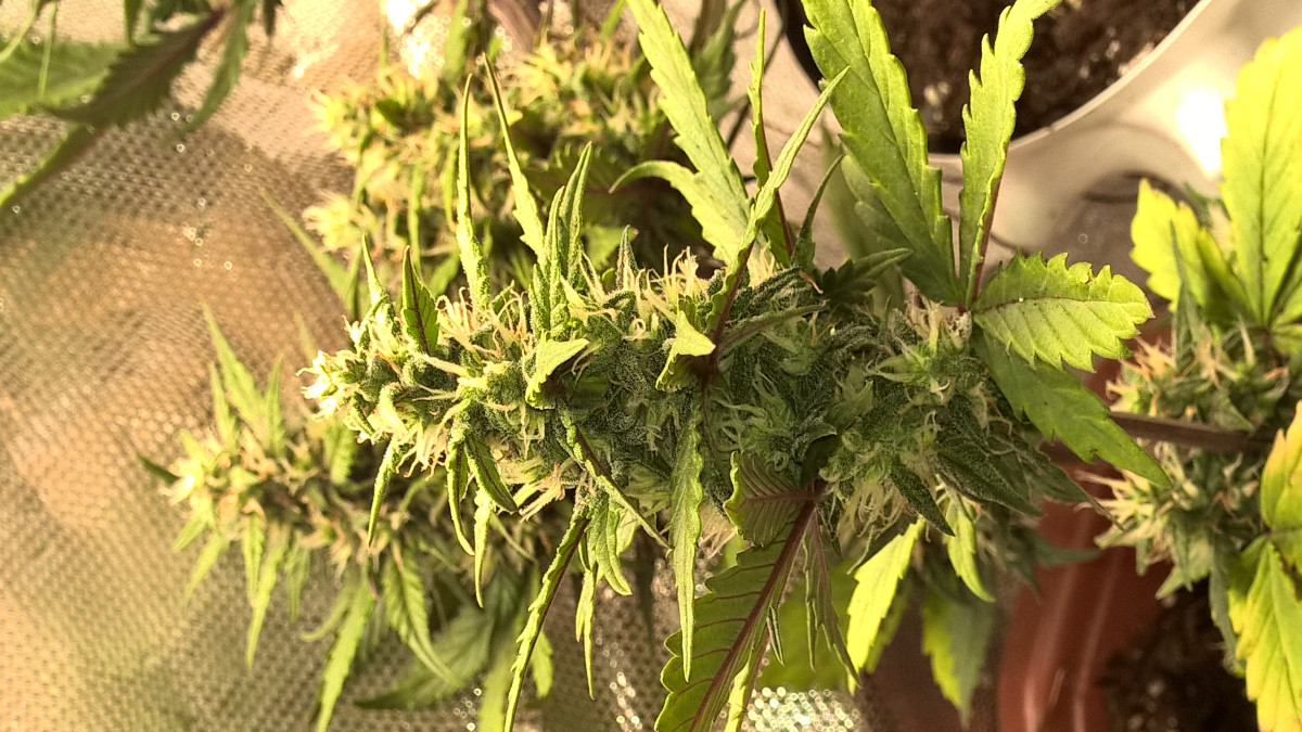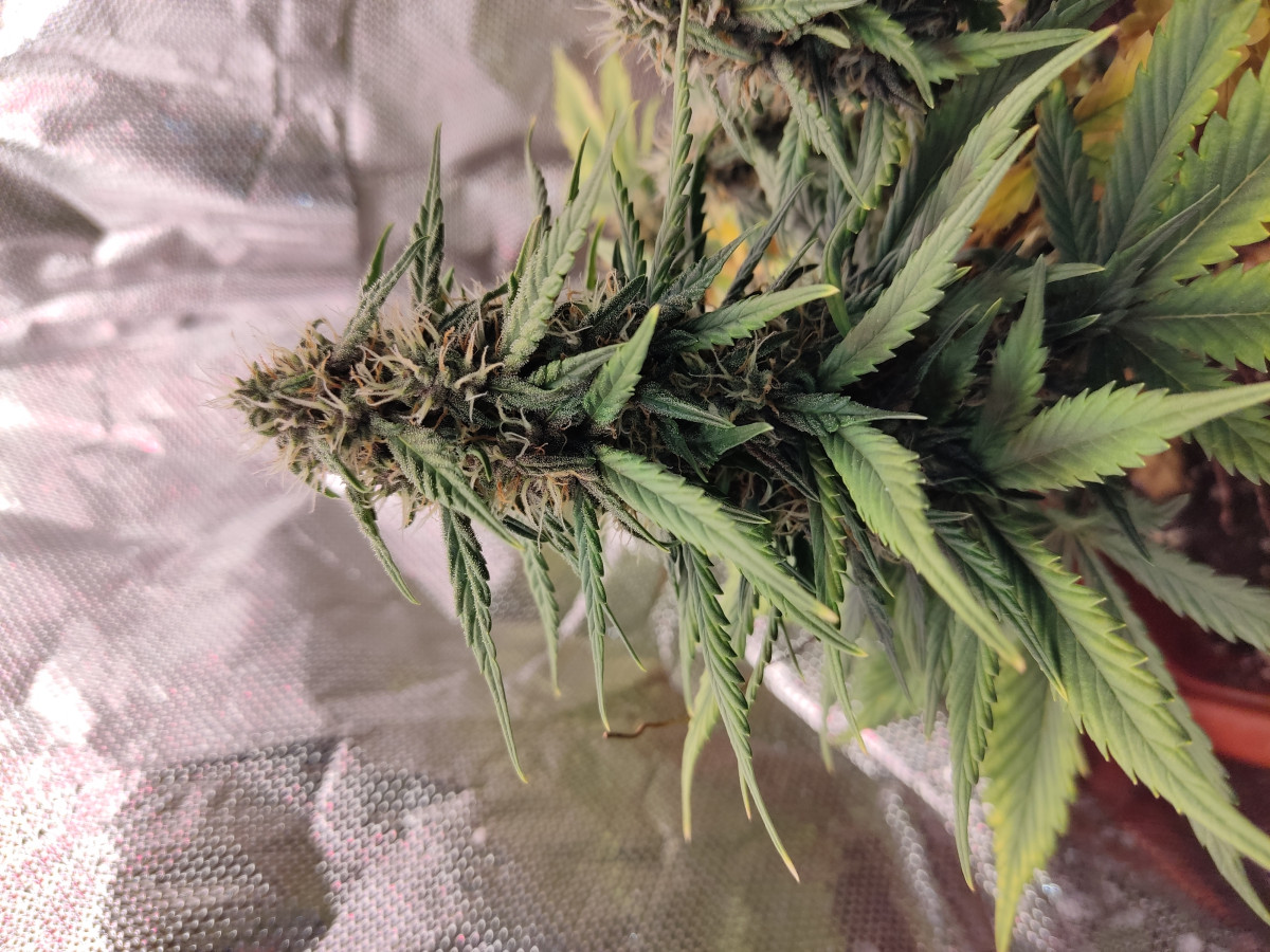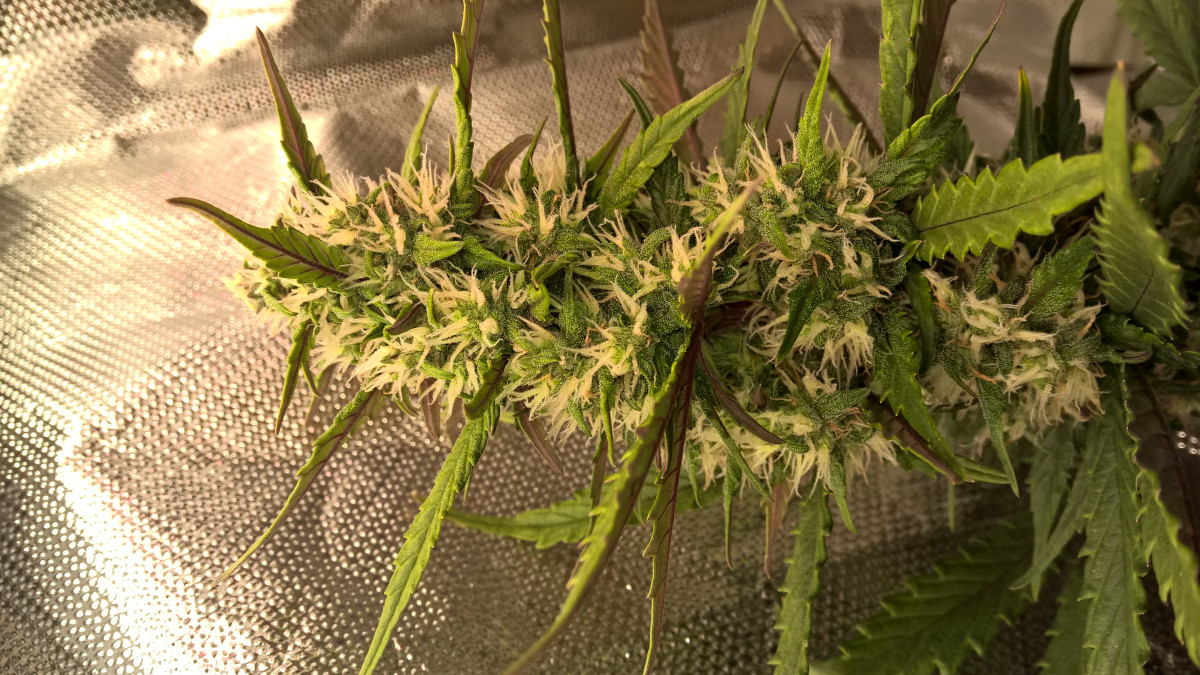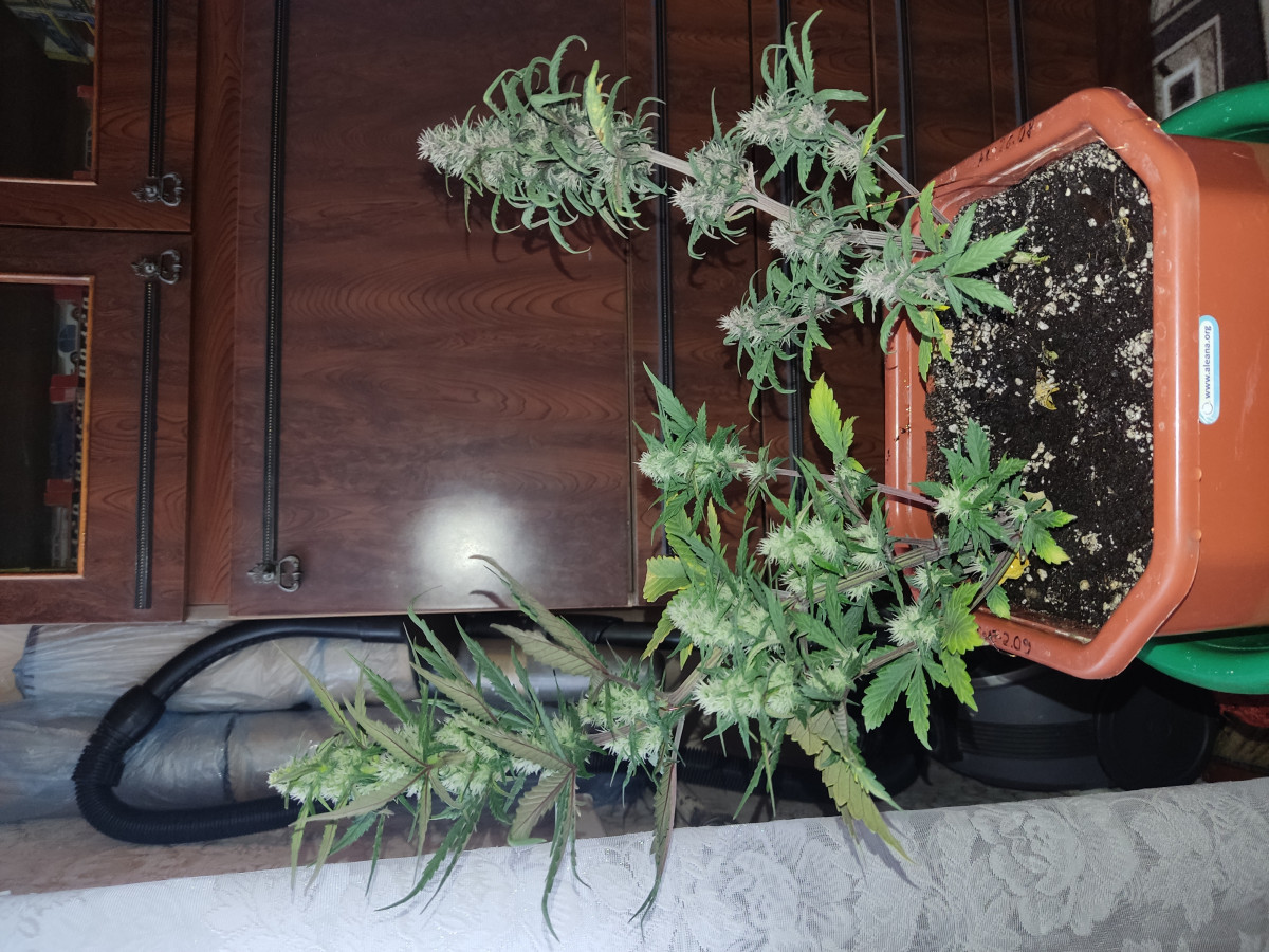 В период веги я психанул, думал, что бракованные, вообще не следил, думал карлики, поставил под эсл лампы и просто поливал фильтрованной водой из под крана, да простит меня ДЖА. Смело передознул несколько раз удобрами, особенно фосфором, затем уехал на день, оставив в темноте, затем опять включил свет, несколько раз окно оставалось открыто, был жуткий холод, листья пооподали, а шишки тем временем становились все более темных цветов. Я уже тогда чувствовал, что будет, скорее всего, что-то крайне необычное. Не знаю, может из-за этих жестких тренировок, или из-за чего то еще, но эффект просто бомбический, "марокеш" курит в сторонке. До этого ак 47, в котором более 15% тгк не казался таким сильным, но этот отправляет в мир иной. ОЧЕНЬ ЖЕСТКАЯ ВЕЩЬ. Крайне не рекомендую новичкам. Сделал из него концетрат - будто в космос улетаешь, вообще куда-то пропадаешь из реальности на часа 3-4.