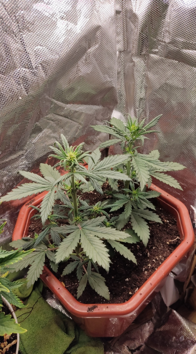 Давно такого сорта не встречал . Очень рано переходит на цвет . Как лоурайдер ) . Если кто помнит ещё такой сорт ) . Фото прилагаю . На фото два экземпляра ,явно видно что перешли на предцвет и это 16 дней от каски . Естественно с таким ранним цветением будут карлики . Кстати видно фенотип чуть отличается . Уже есть запах !