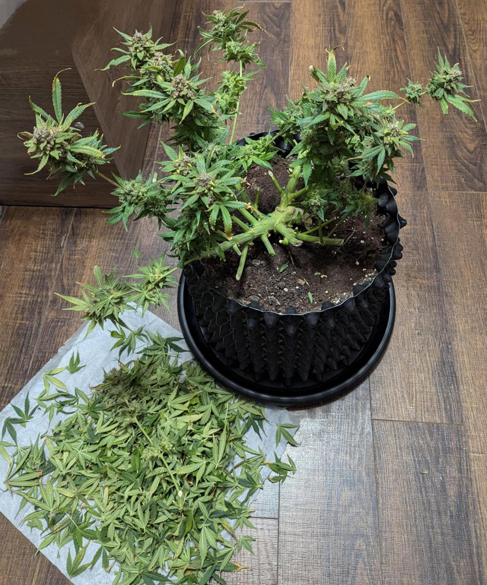Сбор урожая был на 91-й день. Срезали растение по веткам, сделали частичную обрезку и повесили в гроубокс сушиться. Листья после обрезки я решил тоже высушить, так как листьев было много с трихомами. Я сделаю из них кано-масло для кексов и печенья. Температура 24°С, влажность 65%.