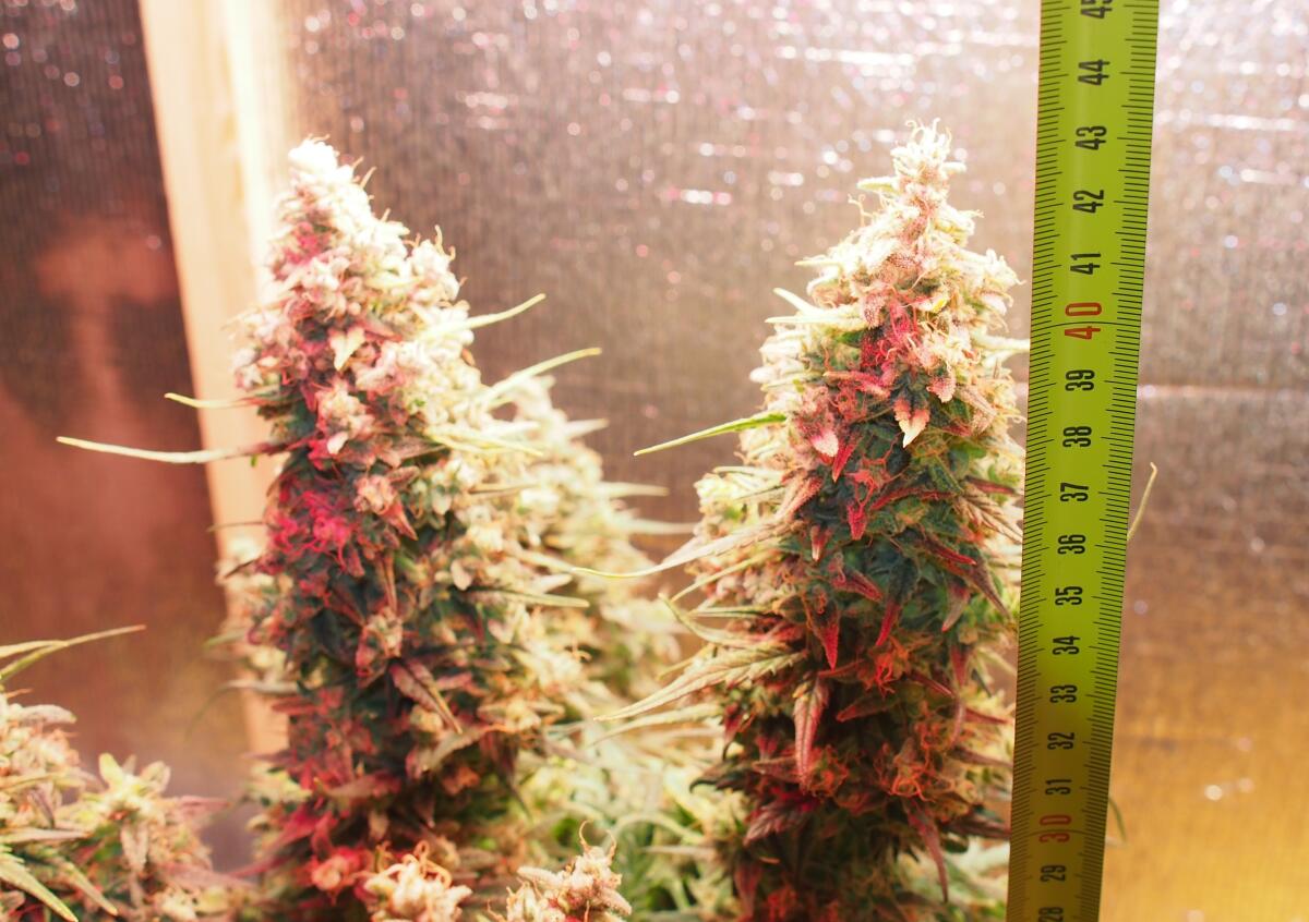 Этот сорт отличный кандидат на стелс-гровинг: очень короткие сроки веги/цветения, маленькая высота – 43 см, компактный куст, нет сильного запаха , высокая плотность соцветий, стресс устойчивый. Харвест вышел 76 дней.