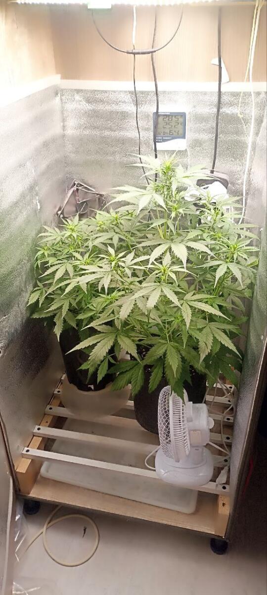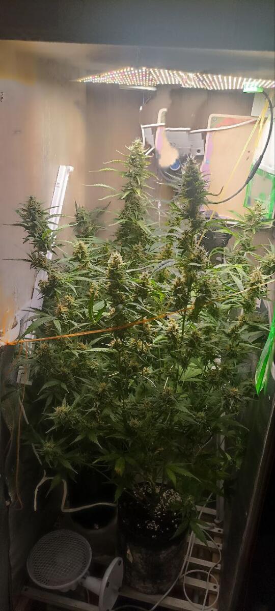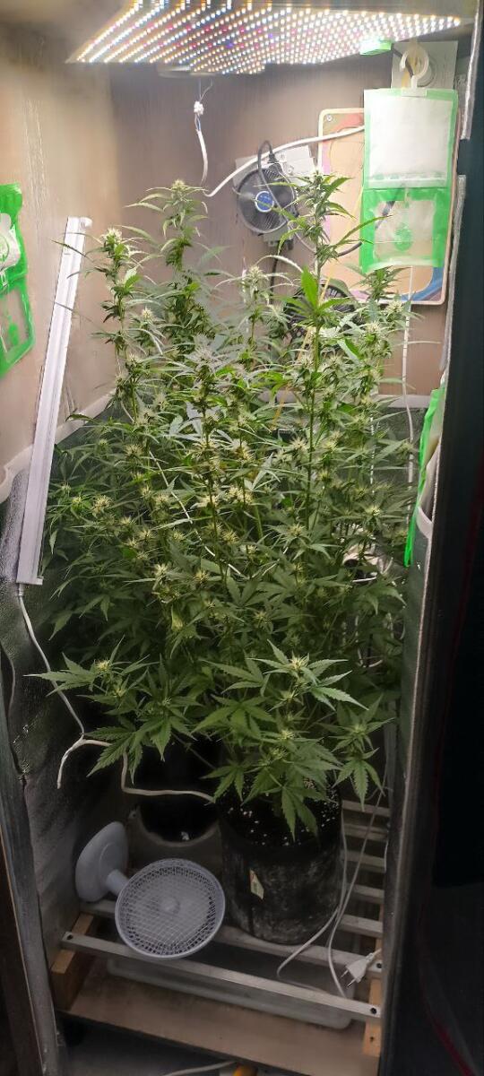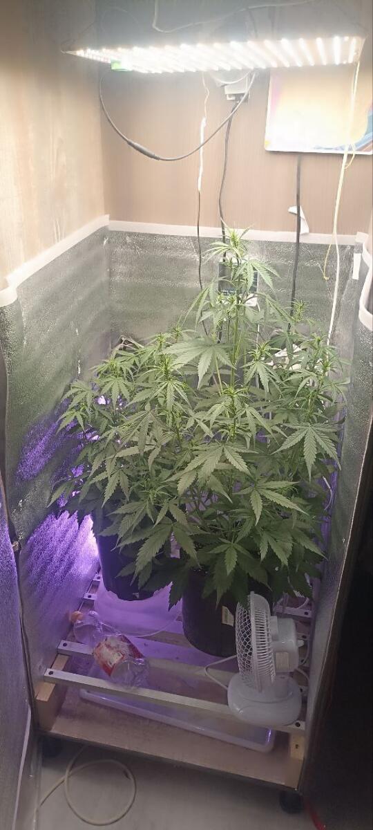 Это мой самый первый гров да ещё и в индоре. Он мне бонусом прилетел и как цветет каннабис видел первый раз. По мере роста покупал всё необходимое. Он бедолага перенес два стресса ( я его почти сломал и одна пересадка в покупной грунт) Короче он натерпелся. Освещение 3 дешёвых led лампы и 2 прожектора по 100 и 70 Вт с цветовой температурой 6000К и 2700К соответственно. Общая мощность 310Вт. Короче маловато. Из удобрений только BioBizz grove и bloom по половине дозы от указанных в инструкции при каждом поливе.Вода только покупная. И даже у меня получился симпатичный кустик. Только он у меня уже 12 недель и всё никак не созреет. Т.к. это мой первый гров то на фото уже трёх кол не хватает. Извините за нетерпячку