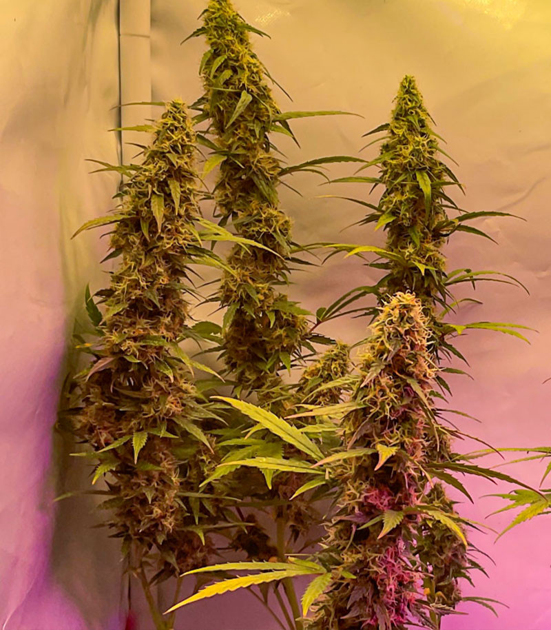 По структуре кусты Zkittlez fem скорее напоминают Индику. Мощная центральная кола окружена множеством более коротких боковых побегов и орнаментом из яркой зеленой листвы, что с приходом цветения постепенно меняет свой окрас на более осенние розово-золотые оттенки. Ждать созревания урожая придется недолго. В помещении фаза цветения занимает 8-9 недель, принося гроверу до 700 грамм с квадратного метра. В ауте может понадобиться чуточку больше времени, но и выход в этом случае составляет порядка 2-2,5 кг продукта с куста при условии своевременного внесения удобрений и обилия солнца.