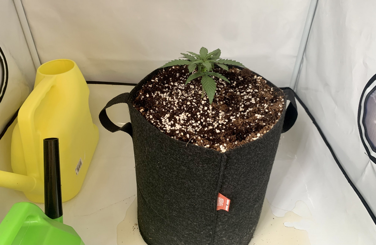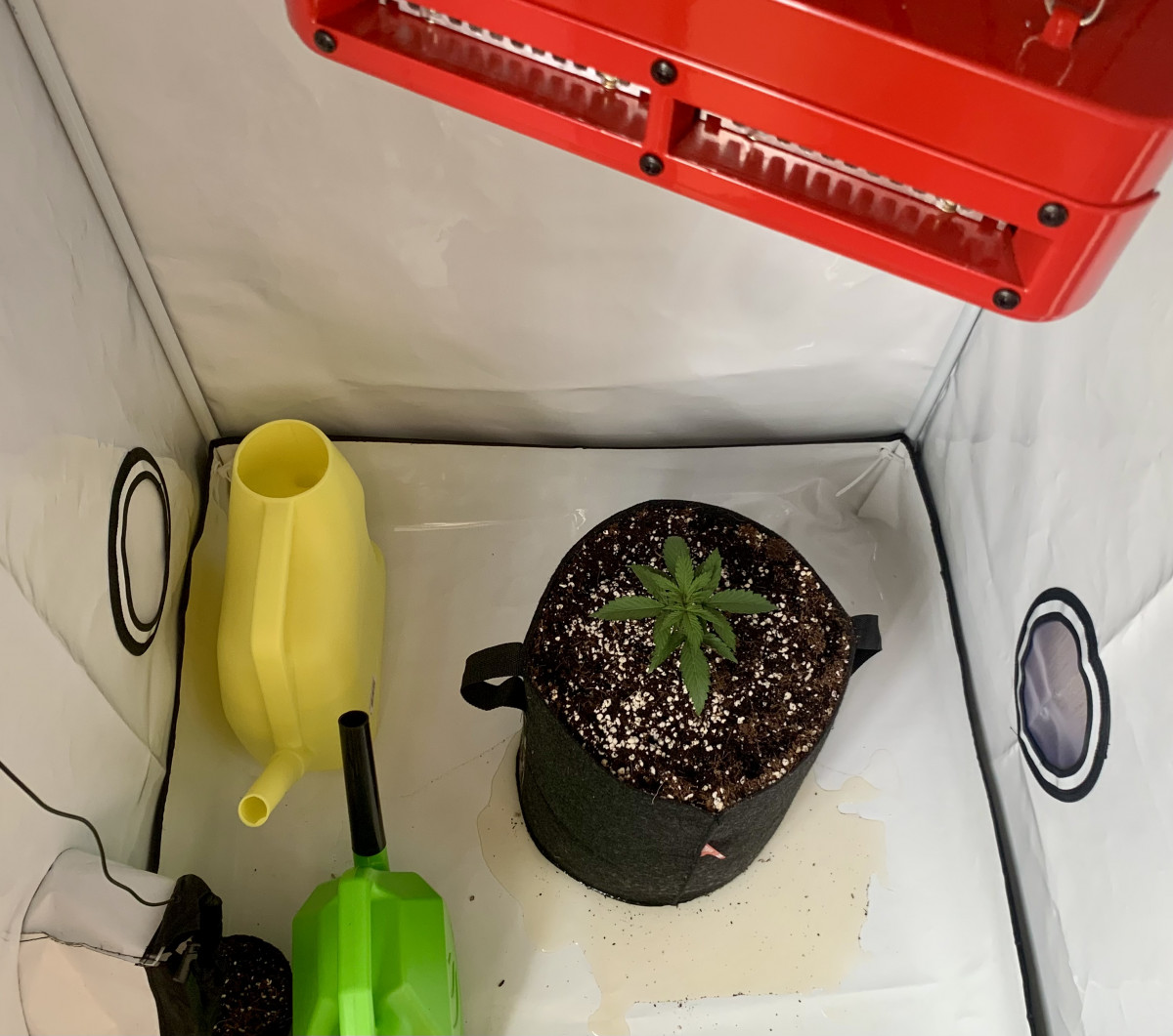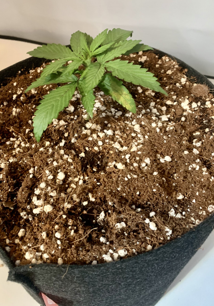 Посадил сразу в большой горшок, в котором пару недель поливал карлика от Fust Buds Cookies auto ( одна из пяти тяжело прорастала, я ее выдернуть решил), в итоге Ph был нарушен и пара нижних листиков это показала, я их удалил, пролил водой с добавлением Pure Zim от Plagron . А четыре оставшиеся Cookies зацвели.
